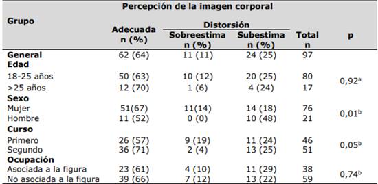 En general, 64% de los estudiantes tuvo una percepción adecuada de su imagen corporal, pero se detectó un 36% (n=35) con distorsión, de estos 67% subestimaban su peso (se percibían con menor peso al real). No se observaron diferencias según grupo de edad, pero en los menores de 25 años la frecuencia de distorsión es ligeramente superior (37% vs 30%). El 48% de los hombres presentó distorsión comparado con 32% de las mujeres, estas sobreestimaron su imagen corporal (14% vs 0%) y los hombres la subestimaron (48% vs 18%) (p=0,01), los del primer curso tienden a sobreestimar su imagen corporal (19% vs 4%) (p=0,05), y no se halló asociación entre ocupación y percepción de imagen corporal. (Tabla 4).