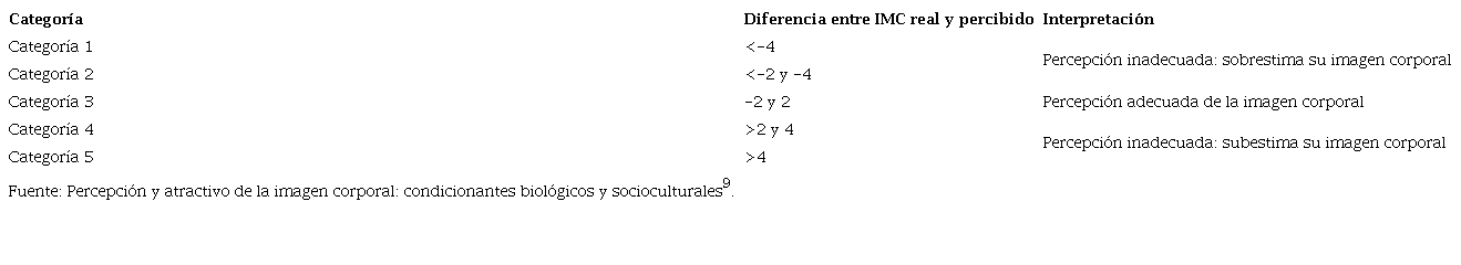 La adecuación de la percepción de imagen corporal se obtuvo de la diferencia entre el IMC real y el IMC percibido identificado en las figuras, categorizándose como se indica en el Cuadro 1.