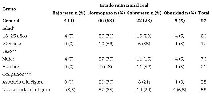 Al evaluar el estado nutricional real de los encuestados, la mayoría de ellos presentó un diagnóstico de peso normal (68%), seguido del sobrepeso (23%). El exceso de peso en general estuvo presente en el 28% de los estudiantes evaluados, primó en el grupo de mayores de 25 años y quienes no tenían ocupaciones asociadas a la figura; fue significativamente mayor en hombres que en mujeres (p=0,004), en las mujeres primó el peso normal y todos los casos de bajo peso fueron registrados en ellas (Tabla 1).