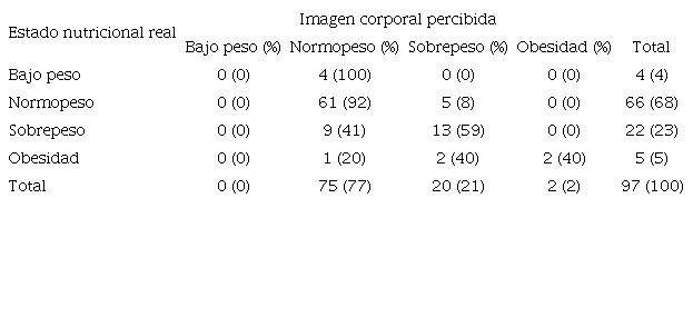 Existe una concordancia moderada entre el estado nutricional real y la imagen percibida entre los normopeso, no así en los extremos del bajo peso y obesidad donde la diferencia es significativa, en los primeros sobrestimando y en los segundos, subestimando su peso, lo que se traduce en distorsión de imagen corporal.