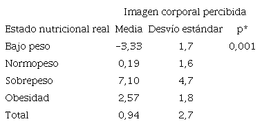 Para valorar la percepción de imagen corporal, se emplean la discrepancia entre el IMC real y el IMC que corresponde a la figura con la que se percibieron. Al determinar las medias de discrepancia según estado nutricional real, se evidenció que los estudiantes con bajo peso sobreestiman su imagen corporal (-3,33) y la subestiman los estudiantes con sobrepeso (7,10) y obesidad (2,57), las diferencias fueron estadísticamente significativas (Tabla 3).