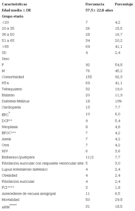 Se incluyeron 168 pacientes entre 18 y 101 años (edad media: 57,5 ± 23 años), 69 pacientes (41,1%) tenían más de 65 años, 92 (54,8%) eran mujeres y 76 varones 76 (45,2%). El 92,3% de los pacientes presentó alguna comorbilidad, siendo la HTA la más frecuente (41,1%) seguido de tabaquismo (19,0%). Sólo 11 (6,5%) pacientes tenían antecedentes de vacuna antigripal. Requirieron ingreso a la unidad de cuidados intensivos con ARM 31 (18,5%) pacientes. La mortalidad fue de 29,8%. Ver Tabla 1