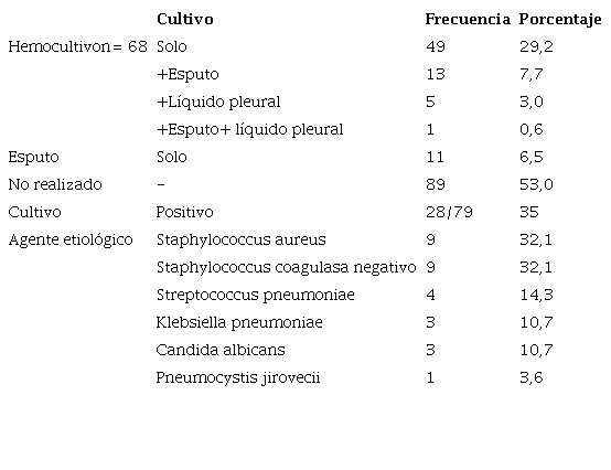 Se realizó cultivo de muestras biológicas en 79 pacientes. Los hemocultivos se realizaron en 68 pacientes, esputo en 25 y en líquido pleural en 6. Se aislaron microorganismos en 28/79. 22 hemocultivos, 12 muestras de esputo y seis de líquido pleural resultaron positivos. Los gérmenes aislados más frecuentemente en igual porcentaje fueron: Staphylococcus aureus sensibles a la meticilina y Staphylococcus coagulasa negativo (32,1%), seguido de Streptococcus pneumoniae (10,7%). Ver Tabla 2