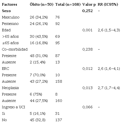 La mortalidad se presentó en 50 pacientes (29,7%), fallecieron 5 pacientes de los 31 ingresados a la unidad de cuidados intensivos (16,1%) y 45 (32,8%) de los 137 que estaban internados en salas de internación, la diferencia no llegó a ser significativa. La edad mayor a 65 años se asoció con la mortalidad (p= 0,001). Las patologías de base como IRC y neoplasia se relacionaron al óbito. Ver tabla 3