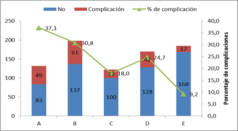 En la Figura 1 se puede observar el porcentaje global de complicaciones de las cirugías realizadas por cada residente durante los dos años de entrenamiento. El residente A tuvo el mayor porcentaje con 37,1% de complicaciones y el residente E el menor con 9,2%.