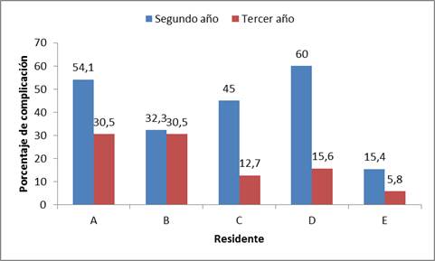 Al comparar la tasa de complicaciones para cada residente por año, se puede observar diferencias importantes entre ellos, así el residente D en el primer año tuvo una tasa de 60% que se redujo a 15,6% en el segundo año, por su parte el residente E quién registró la menor tasade complicaciones, de 15,4% bajó a 5,8%. Figura 2