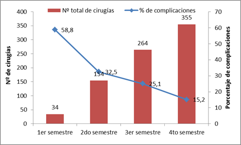 En la Figura 3 se observa el porcentaje de disminución de las complicaciones en los semestres consecutivos, comenzando con 58,8% en el primer semestre y llegando al final de la residencia con un 15,2%.