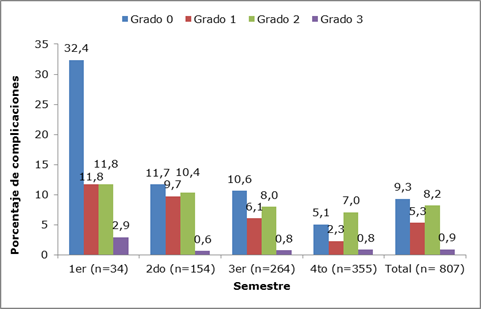 En la Figura 4 se presenta la tasa del grado de complicaciones por semestre. Se puede observar que las complicaciones grado 3 se mantuvieron por debajo del 1% entre el segundo y cuarto semestre. Los de grado 2 estuvieron entre el 7% en el cuarto semestre y 11,8% en el primero.