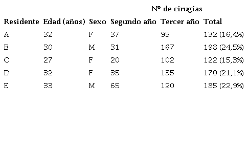 En la Tabla 1 se presentan los datos demográficos de los residentes y el número total de cirugías realizadas por los mismos en sus dos años de entrenamiento. Tres eran mujeres y dos varones, entre 27 a 33 años de edad. De las 807 cirugías realizadas por los residentes en los dos años de entrenamiento, el residente codificado B realizó el mayor número con 198 (24,5%) cirugías y el codificado C la menor cantidad de cirugías, 122 (15,3%). Al comparar el número de cirugías realizadas en el segundo y tercer año de residencia, se observó un aumento importante en el número de cirugías en el tercer año. De un promedio de 37 cirugías por residente en el segundo año a un promedio de 124 en el tercer año.