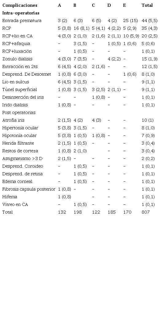 En la Tabla 3 se presentan las complicaciones intraoperatorias y post operatorias. Entre las complicaciones intraoperatorias más numerosas tenemos; entrada prematura con 44 (5,5%), ruptura de capsula posterior 35 (4,3%), ruptura de capsula posterior con implante de lente intraocular en cámara anterior 20 (2,5%), zonulodialisis 15 (1,9%). El resto representa menos del 1%. Entre las posoperatorias más frecuentes se citan la atrofia de iris, hipertonía e hipotonía ocular en 10, 8 y 7 cirugías, respectivamente. Los residentes D y E no tuvieron registro de complicaciones post operatorias.