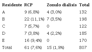 En la Tabla 4 se presenta la frecuencia de ruptura de capsula posterior y zonulodialisis por residente, donde podemos ver un total de 61 (7,6%) casos de RCP y 15 (1,9%) casos de zonulodialisis. El residente B tuvo la mayor frecuencia de RCP y zonulodialisis con 22 y 7 casos, respectivamente. El residente E tuvo 16 casos de RCP pero ninguno de zonulodialisis.
