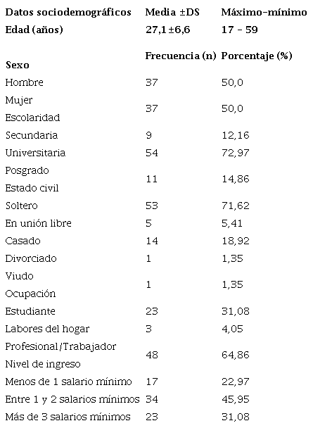 Participaron 74 personas que entrenan en gimnasios de Asunción, con distribución equitativa de hombres y mujeres, una mediana de edad de 26 años, la mayoría de nivel educativo universitario y estado civil soltero. El 48% fueron profesionales, con salario igual o superior al mínimo (Tabla 1).