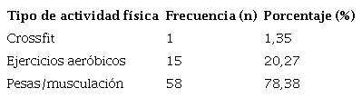 Más de tres cuartas partes (78,38%) de los usuarios encuestados realizaban actividad física de tipo anaeróbica que incluía pesas y musculación (Tabla 2).