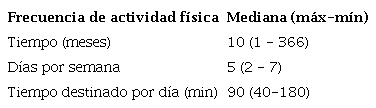 La mediana de asistencia al gimnasio fue 10 meses, 5 días a la semana y un tiempo destinado al entrenamiento de 90 minutos diarios (Tabla 3).