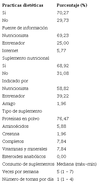 La mayoría de los usuarios se encontraba practicando dieta y algún suplemento nutricional (70,27% y 68,92%, respectivamente), indicadas en su mayoría por un profesional nutricionista. El tipo de suplemento de mayor consumo fueron las proteínas en polvo (76,47%). La mayoría de los usuarios, manifestó que consideran necesaria la presencia de nutricionistas en los gimnasios que orienten al logro de los objetivos, pero con pautas saludables y controladas (Tabla 4).