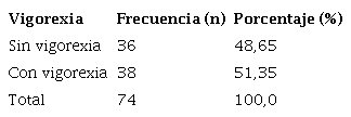 La frecuencia de vigorexia encontrada fue de 38/74 (51,35%) usuarios de gimnasios de Asunción (Tabla 5). De los 38 casos de vigorexia, 22 eran hombres y 16 mujeres.
