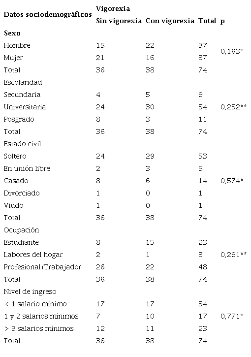 No se encontró posible asociación estadísticamente significativa entre los datos sociodemográficos y la frecuencia de vigorexia (Tabla 6).