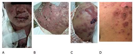 El examen físico al ingreso reveló en piel, lesiones eritemato- purpúricas, ampollas, áreas denudadas, costras hemáticas, signo de Nikolsky negativo, localizadas en áreas fotos expuestas (rostro, cuello, escote, espalda), incluso en mucosa labial. (Figuras 1A,B,C).