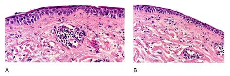 Biopsia de piel: Epidermis atrófica de aspecto regenerativo con daño vacuolar del estrato basal con presencia de aislados cuerpos apoptóticos. Ligero engrosamiento de la membrana basal. Dermis superficial cuerpos coloides, leve infiltrado inflamatorio perivascular. (Figura 2A, 2B). Dermatitis de interfase de tipo vacuolar, se plantea que se trate de manifestación cutánea del Lupus Eritematoso.