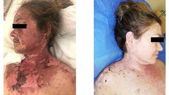 Mujer de 42 años, internada en el Servicio de Medicina Interna el 13/05/2020 por un cuadro de 2 semanas de evolución, que se inicia con secreción purulenta en el sitio de inserción de catéter de hemodiálisis y aparición de ampollas de diferentes tamaños localizadas en cuello, tronco, rostro y orejas que con el correr de los días drenan liquido seroso de forma espontánea dejando lesiones eritemato-descamativas. El cuadro se acompaña de sensación febril y escalofríos que ceden parcialmente con antipiréticos comunes. Es tratada en un centro asistencial de su localidad con vancomicina y carbamacepina. Por falta de mejoría, es remitida a nuestro Hospital. Niega cuadro similar anterior.