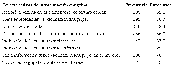 En la Tabla 2 se presentan las características de la vacunación antigripal en las embarazadas. La cobertura de vacunación fue del 62,2%, el 66,6% de las embarazadas recibieron indicación por un personal de salud para la vacunación antigripal, el 50,7% tenía antecedente de vacunación, una (0,4%) gestante tuvo efecto adverso de la vacuna antigripal (cuadro tipo influenza).