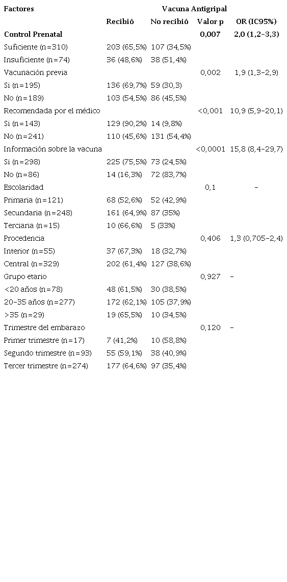 Los factores relacionados con la cobertura de la vacuna contra la influenza fueron el presentar un control prenatal suficiente (p=0,007, OR: 2), vacunación previa (p=0,002, OR: 1,9), haber recibido recomendación del médico (p<0,001, OR: 10,9) y tener información sobre la vacuna (p<0,0001, OR: 15,8). La escolaridad, procedencia, grupo etario y trimestre del embarazo no se asociaron con la no vacunación de las embarazadas. Tabla 3