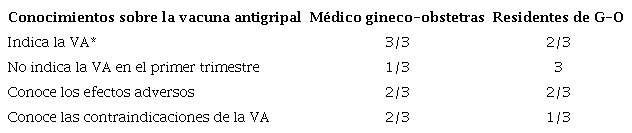 Por otro lado, se entrevistaron a los profesionales de la salud encargados del control prenatal sobre la vacuna antigripal en embarazadas; tres gineco-obstetras y tres residentes. Los tres médicos gineco-obstetras afirmaron que indican la vacunación a sus pacientes, uno no indica en el primer trimestre, dos conocen los efectos adversos y las contraindicaciones de la vacuna antigripal. Dos de los tres residentes indican la vacunación a sus pacientes, los tres no indican en el primer trimestre, dos conocen los efectos adversos y uno las contraindicaciones de la vacuna antigripal. Tabla 4