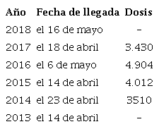 Se solicitó información a los responsables de la unidad de vacunación del Hospital Nacional en relación a la fecha de llegada y dosis administradas de la vacuna anti-influenza en los últimos 5 años. Se tiene el registro de la fecha de llegada de la vacuna contra la influenza, pero no se cuenta con el registro de la vacunación contra la influenza en las mujeres embarazadas. Las fechas de llegada de la vacuna son entre abril y mayo. Tabla 5
