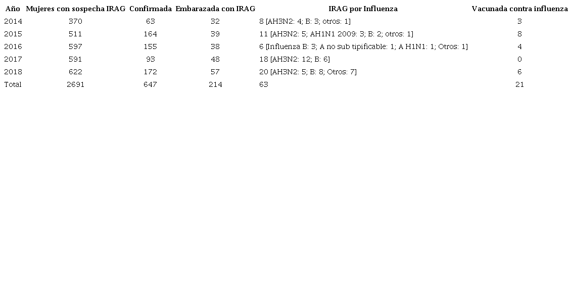 Por último, se realizó una revisión retrospectiva de las historias clínicas de mujeres hospitalizadas con sospecha de insuficiencia respiratoria aguda grave (IRAG) entre 2014 y 2018. En este periodo se hospitalizaron 2691 mujeres con sospecha de IRAG, confirmándose en 647. De estas últimas, 214 estaban embarazadas y de ellas en 63 se confirmó influenza. De las embarazadas con influenza, 21 estaban vacunadas. En la Tabla 6 se presenta la distribución del número de mujeres con sospecha de IRAG, de mujeres con IRAG confirmada, de embarazada con IRAG, de embarazada con IRAG por influenza y de embarazada vacunada contra la influenza en el periodo 2014 a 2018.