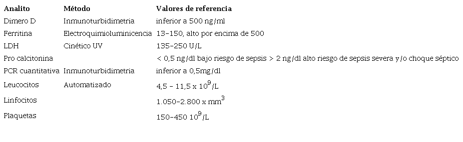 Un gran porcentaje de los pacientes presentaron valores alterados de laboratorio compatibles con un perfil inflamatorio alterado, como se describen en todas las series. Niveles elevados de PCR (92,1%), de ferritina (91%), de D dimero (82%) y de láctica deshidrogenasa (LDH) fueron los más frecuentes.