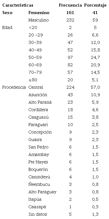 Se estudiaron 393 pacientes, 309 pacientes fueron derivados de otros centros hospitalarios (53,2%). Hubo mayor proporción de pacientes del sexo masculino (59%), la mediana de la edad fue de 56 años el 57% era procedente del departamento Central y 10,9% de Asunción. El 12,5 % (n= 49) era personal de salud. Ver Tabla 1