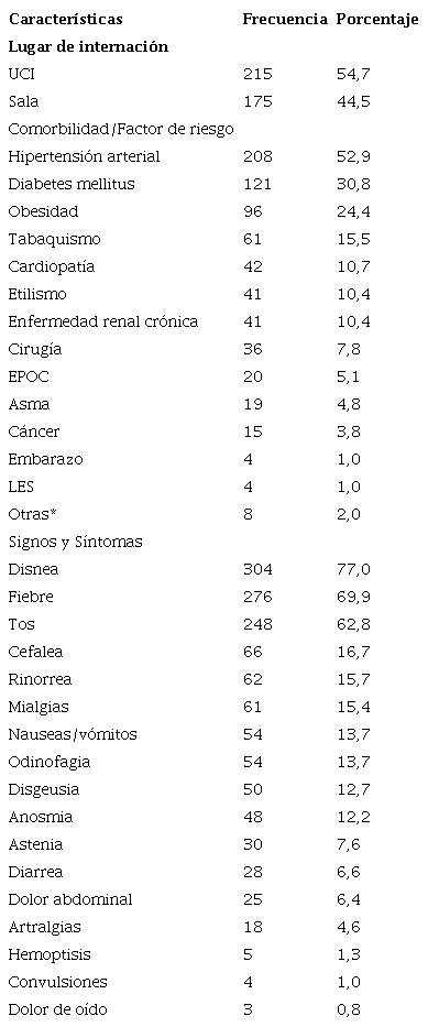 El 54,7% estuvo internado en la unidad de terapia intensiva respiratoria. El 82,5% de los pacientes presentó alguna comorbilidad, las más frecuentes fueron hipertensión arterial (52,7%), diabetes mellitus (30,8%) y la obesidad en un (24,3%). El 27,1 % presentaron dos comorbilidades, el 26,3 % tres comorbilidades. Las manifestaciones clínicas más frecuentes fueron la disnea en un (77,2%) la fiebre (70,1%), y la tos (60,9%). Ver Tabla 2