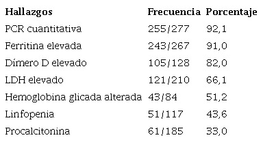 En la Tabla 3 se presentan los hallazgos de laboratorio. El 92,1% de los pacientes tenía niveles elevados de PCR, 91% de ferritina, 82% de D dimero, entre los más frecuentes.