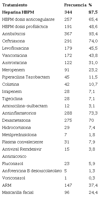 El 87,5% de los pacientes recibieron heparina de bajo peso molecular, el 65% fue en dosis anticoagulante y el 48,6% dosis profiláctica. El 93,4% recibió tratamiento antibiótico, 74 % con ceftriazona. El 70 % recibió dexametasona, el 3,8% remdesivir y 7,9% plasma convaleciente. Ver Tabla 4
