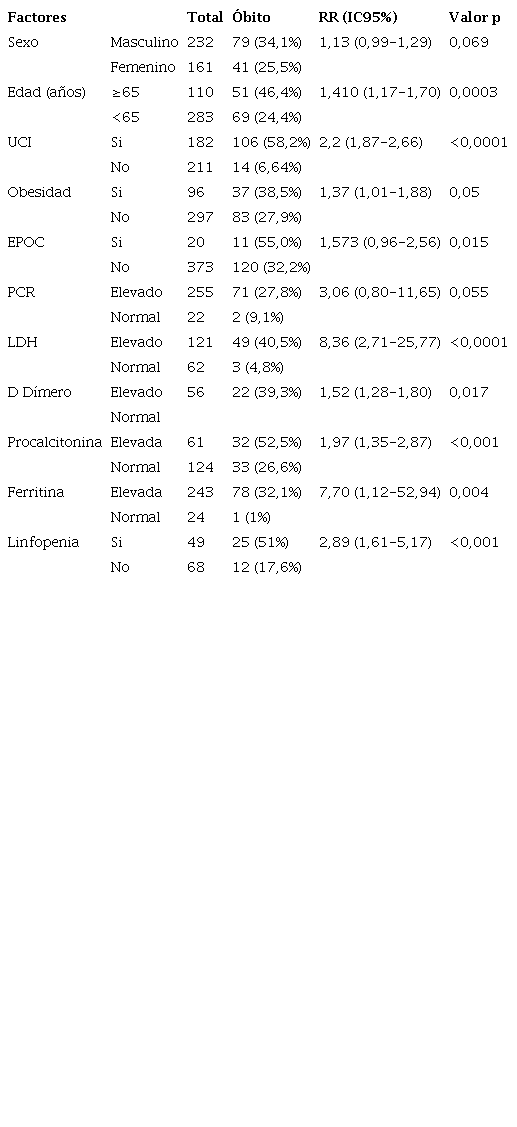 La letalidad global fue del 30,3%, en la unidad de cuidados intensivos fue del 58,2%. Los factores asociados a la mortalidad fueron edad de 65 años o mayor, obesidad, EPOC, valores elevados de PCR, LDH, D dimero, procalcitonina y ferritina. Tabla 5