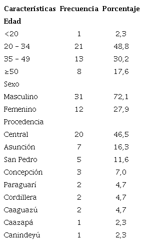 Se estudió una muestra de 43 pacientes con diagnóstico de meningitis criptocócica asociado al VIH, ingresados en el Instituto de Medicina Tropical (IMT) en el año 2019. El 72,1% (n=31) era del sexo masculino. El 48,8 % (n = 21) tenía 20 a 34 años (edad promedio = 37,9 ± 13,6 años). El 46,5% era del departamento Central.