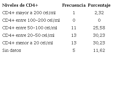 Con respecto a la determinación de CD4+ el 86,04% (n 37) tenía niveles inferiores a 100 cel/ml. El 25,58%, CD4+ entre 100 - 50 cel/ml; 30,23%, CD4+ entre 50 - 20 cel/ml y el 30,23%, CD4+ menor a 20 cel/ml (Tabla 2).