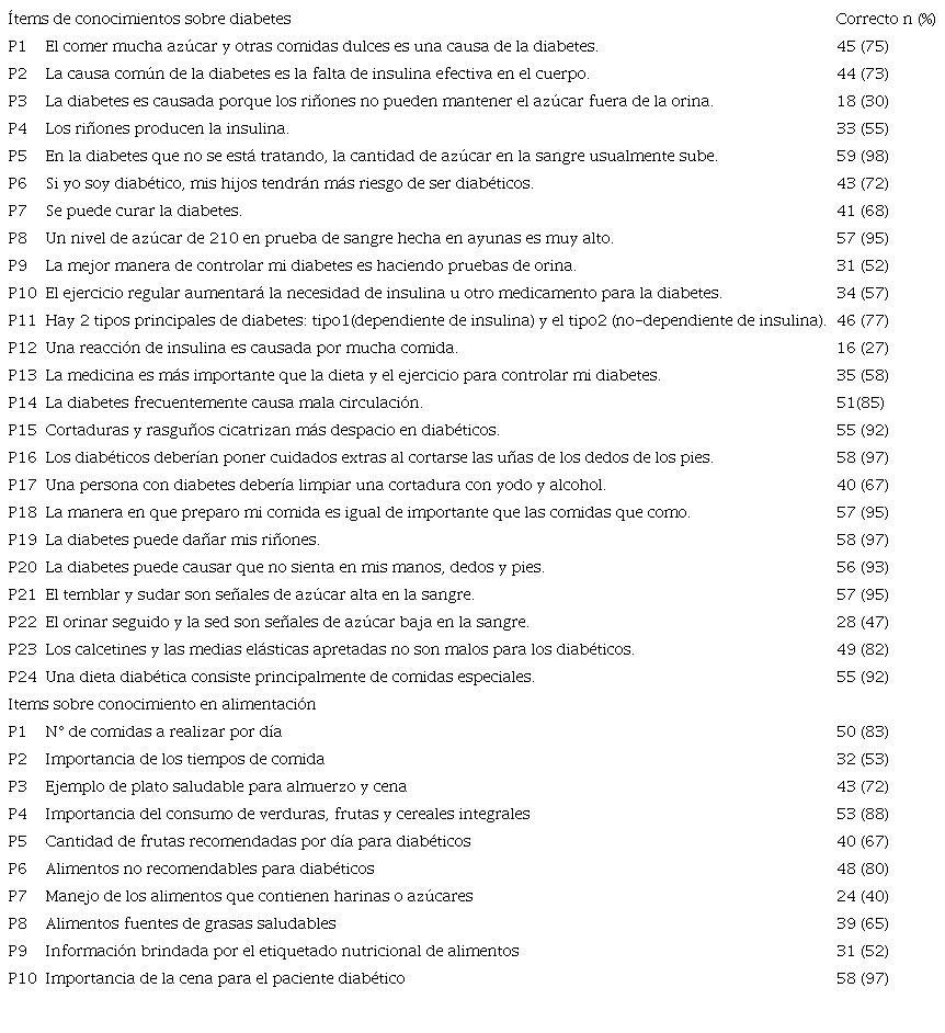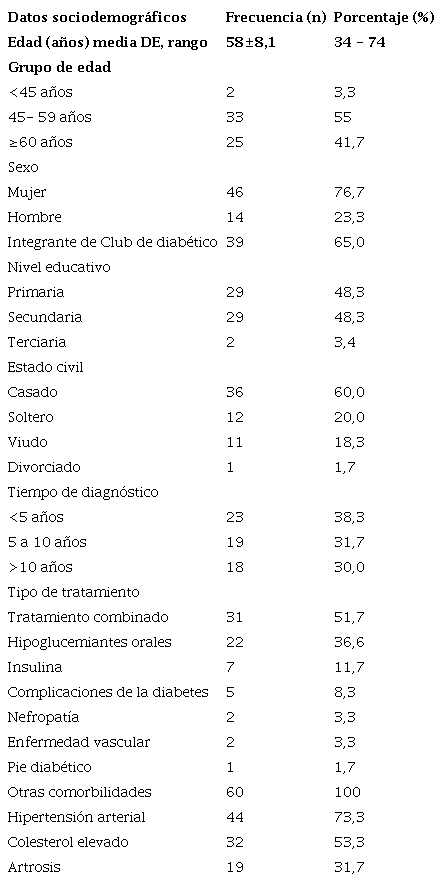 La muestra estuvo conformada por 60 pacientes diabéticos, con una edad promedio de 58 años, 55% tenía entre 45 y 59 años de edad, 76,7% eran mujeres; 39 formaban parte del club de diabéticos del hospital asistiendo a sus charlas mensualmente, la proporción restante solo acudía para sus consultas médicas; en igual proporción (48,3%) tenía nivel primario y secundario. De los 60 pacientes, 37 fueron diagnosticados con diabetes hace 5 años o más, el tratamiento más frecuente fue el combinado (insulina e hipoglucemiantes orales). Sólo 5 pacientes manifestaron tener diagnóstico de alguna de las complicaciones propias de la diabetes. Otras comorbilidades fueron la hipertensión arterial, el colesterol elevado y la artrosis (73%, 53% y 32%, respectivamente) (Tabla 1).