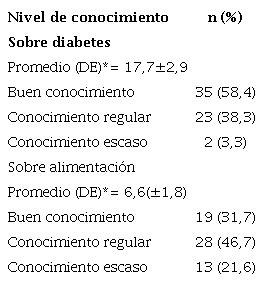 El puntaje medio de conocimiento fue diabetes fue 17,7±2,9; el nivel de conocimiento fue bueno en 58,4% de los pacientes evaluados. En cuanto a alimentación, el desconocimiento fue mayor en lo referente a manejo de los alimentos que contienen harinas y azúcares (60%) y la información brindada por el etiquetado nutricional de alimentos (48,3%). El puntaje promedio de conocimiento sobre alimentación fue de 6,6±1,8, y al evaluar el nivel de conocimientos en alimentación del diabético, solo 31,7% presentó buen conocimiento (Tabla 3).