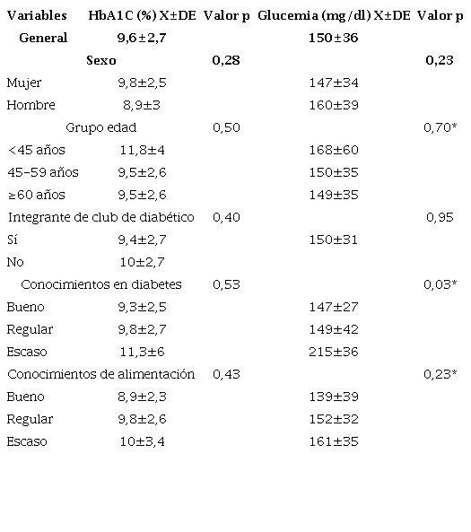 Los valores medios de hemoglobina glicada (9,6%) y glucemia basal (150 mg/dl) indicaron un mal control glucémico de la muestra general. Sus valores fueron superiores en los menores de 45 años, en quienes no pertenecían al club de diabéticos del hospital y los que presentaron escasos conocimientos sobre diabetes y alimentación. Se encontró asociación entre glucemia basal y nivel de conocimiento de diabetes (p=0,03). No se encontró asociación entre conocimiento de alimentación y control glucémico por ninguno de los dos métodos. (Tabla 4)