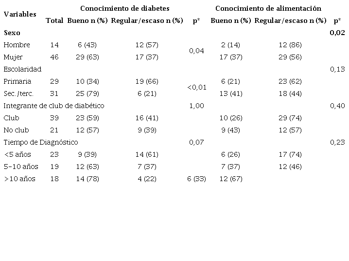 El conocimiento de diabetes fue significativamente mayor en mujeres (p=0,04) y en educación secundaria y terciaria (p<0,01); se encontró tendencia de mejor conocimiento a mayor tiempo de diagnóstico (p=0,07). No se encontraron diferencias estadísticamente significativas en el nivel de conocimientos de alimentación según características demográficas ni tiempo de diagnóstico (Tabla 5).