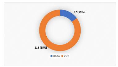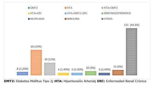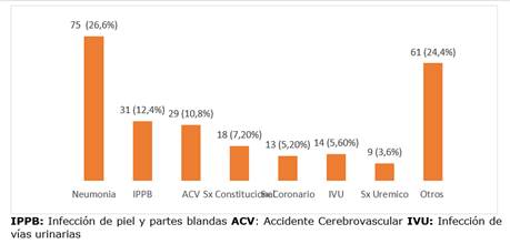 El 26,6% de los pacientes ingresaron por neumonía adquirida en la comunidad, seguido por infección de piel y partes blandas en un 12,4%. Respecto a las comorbilidades, 24% correspondieron a portadores de hipertensión arterial, 3,20% de diabetes mellitus tipo 2, inmunodeprimidos en un 4%, neoplasias 2,40%, portadores de diabetes mellitus tipo 2 e hipertensión arterial 12%, además de enfermedad renal crónica en un 2,40%. Resultaron con desenlace fatal 37 pacientes (15%).
