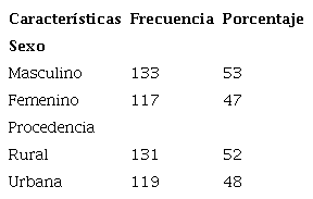 En el periodo de estudio estuvieron internados 1469 pacientes adultos mayores en el Servicio de Clínica Médica, de los cuales 250 se incluyeron en el estudio, 133 (53,2%) era del sexo masculino; la media de edad fue 74 años (rango 66-99 años). Pertenecían al área rural un 52,4%.