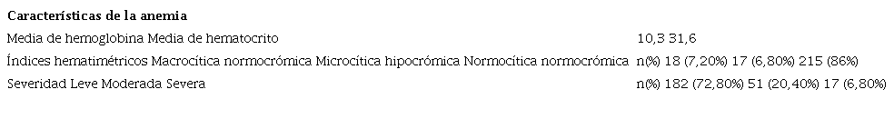 La media de hemoglobina fue de 10,3 g/dL. El 7,20% de la anemia fue macrocítica normocrómica, 6,80% resultaron microcíticas hipocrómicas, y un 86% normocíticas normocrómicas. En cuanto a la severidad de anemia, 72,8% fueron leves, 20% moderadas, y la restante severa (6,8%). Tabla 2