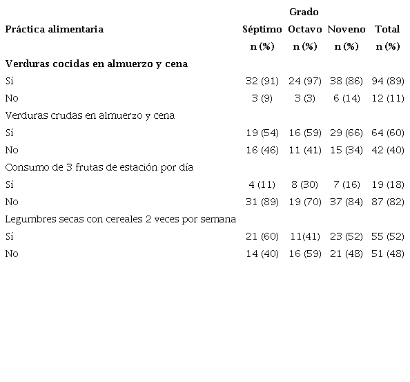 En la muestra total, el hábito de consumir verduras crudas diariamente fue menor que para las verduras cocidas (60% vs 89%, respectivamente), siendo menor el consumo de verduras crudas en los del séptimo y octavo grado. Respecto al consumo de frutas, 93,4% refirió consumir frutas diariamente, pero solo el 18% alcanzó 3 frutas diarias, la menor frecuencia se dio en los del séptimo grado (11%). Más de la mitad de los estudiantes (52%) manifestó consumir legumbres secas con cereales al menos dos veces por semana, siendo la frecuencia mayor en los del séptimo grado (60%) (Tabla 1).