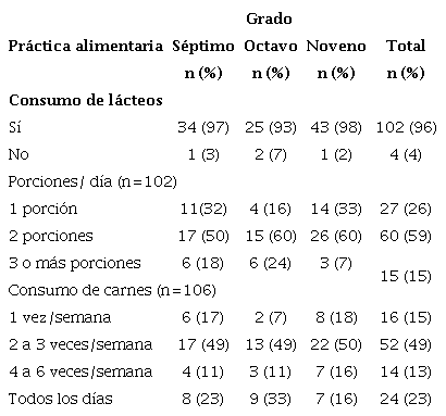 El 96% consumió lácteos diariamente, de estos el 15% (n=15) refirió consumir 3 o más porciones por día. De los que consumían lácteos diariamente, al estratificar por grado, se observó que en todos los cursos la mayoría consumía 2 porciones de lácteos y solo 7% (n=3) consumió 3 o más porciones en el noveno grado. El consumo de carnes reportado con mayor frecuencia fue de 2 a 3 veces por semana (49%) (Tabla 2).