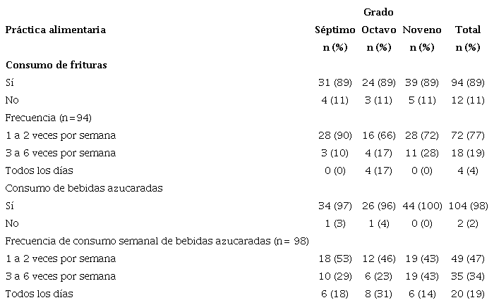 Casi la totalidad de adolescentes encuestados refirieron consumir frituras y de estos más de tres cuartas partes, con una frecuencia de 1 a 2 veces por semana; así también el consumo de bebidas azucaradas fue referido por 104 encuestados, y más de la mitad (n=55; 53%) con una frecuencia de entre tres y todos los días y al estratificar por grado, los que refirieron mayor frecuencia de consumo, son los del noveno (Tabla 3).