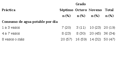 Más de la mitad de los adolescentes encuestados reportaron consumir menos de 8 vasos de agua potable (53%). El consumo de 8 vasos o más de agua por día es más bajo en los de noveno grado (Tabla 4).