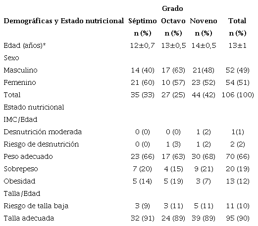 La muestra estuvo conformada por 106 adolescentes del séptimo a noveno grado de la educación escolar básica, 42% pertenecía al noveno grado; la mayoría fue del sexo femenino (54%), primando estas en el séptimo y noveno grado.