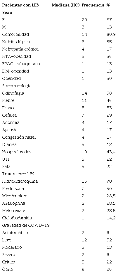De un total de 350 pacientes con LES que consultaron en el periodo junio 2020- agosto 2021, 23 (7%) presentaron COVID-19. Los pacientes con COVID-19 tenían edades entre 19 a 58 años de edad (mediana: 38 años), 20 (87%) del sexo femenino. Presentaron odinofagia 14 (58%), fiebre 11 (46%), disnea 8 (33%), cefalea 7 (29%), anosmia 4 (17%), ageusia 4 (17%), congestión nasal 4 (17%), diarrea 3 (13%). Tenían otras comorbilidades 14 (60,9%). Recibían hidroxicloroquina 16 (70%), prednisona 7 (30%), micofenolato 7 (30%). La enfermedad fue critica en 5 (22%) y severa en 2 (9%), admitidos en UTI 5 (22%) y fallecieron 6 (26%). Tabla 1